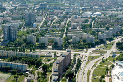 Gdansk Przymorze i Zaspa z lotu ptaka. Osiedle Jelitkowski Dwor u zbiegu ul. Czarny Dwor i al. Jana Pawla II. Aleja to dawny pas startowy lotniska. Po lewej u gory szpital. Po prawej osiedle Trzy Zagle. 30.05.2011 Fot. Maciej Kosycarz / KFP