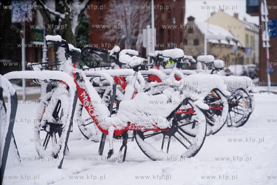 Zima z Gdańsku. Zaśnieżony rowery miejskie MEVO na skwerze Macieja Kosycarza. 11.01.2025 fot. Paweł Marcinko / KFP