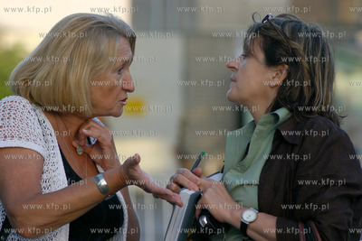 Gdansk. Obchody 25. rocznicy Solodarnosci. Przed koncertem "Ku drodze wolnosci". Rozmawiaja Maryla Mrozinska - dziennikarka TVP Gdansk (z lewej) i Nina Rasch -dziennikarka (po sierpniu 80. roku wyemigrowala do Niemiec, mieszka na stale w Hamburgu)