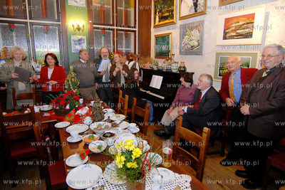 Gdansk - Klub Mestwin. Spotkanie oplatkowe czlonkow gdanskiego oddzialu Stowarzyszenia Dziennikarzy Polskich. Nz.(od lewej) Anna Klim, Nina Rasch, Krzysztof Kurkiewicz, Tadeusz Wozniak, Henryka Dobosz - Kinaszewska, Agnieszka Nowak (przy fortepianie), Alina Glowczynska, Janusz Wikowski, Janusz Rydzewski i Edmund Szczesiak